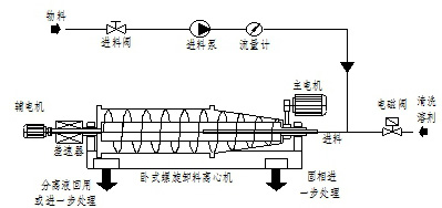 下圖描述了離心機(jī)的主要設(shè)備和系統(tǒng)進(jìn)行工作時(shí)的工藝流程,該系統(tǒng)主要包括臥式螺旋卸料沉降離心機(jī)(主機(jī))、電器控制系統(tǒng)、無軸輸送機(jī)、自動(dòng)控制加藥系統(tǒng)。