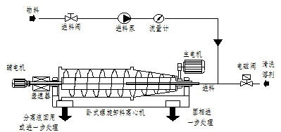 下圖描述了離心機的主要設備和系統進行工作時的工藝流程,該系統主要包括臥式螺旋卸料沉降離心機(主機)、電器控制系統、無軸輸送機、自動控制加藥系統。